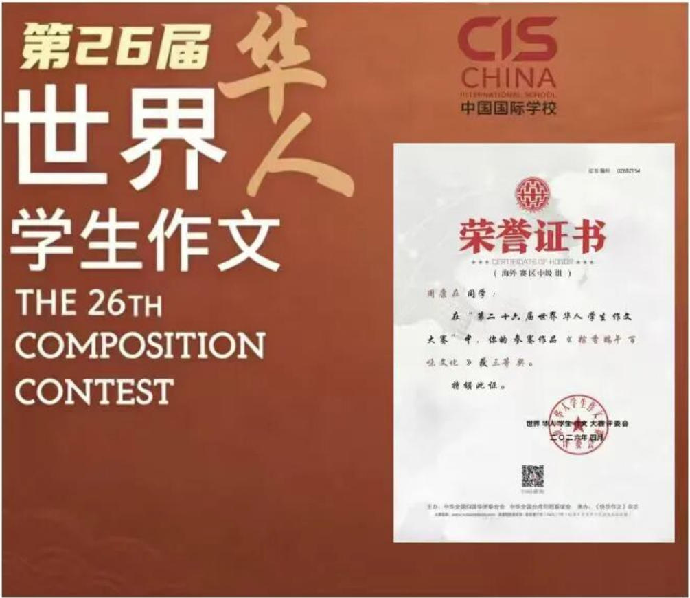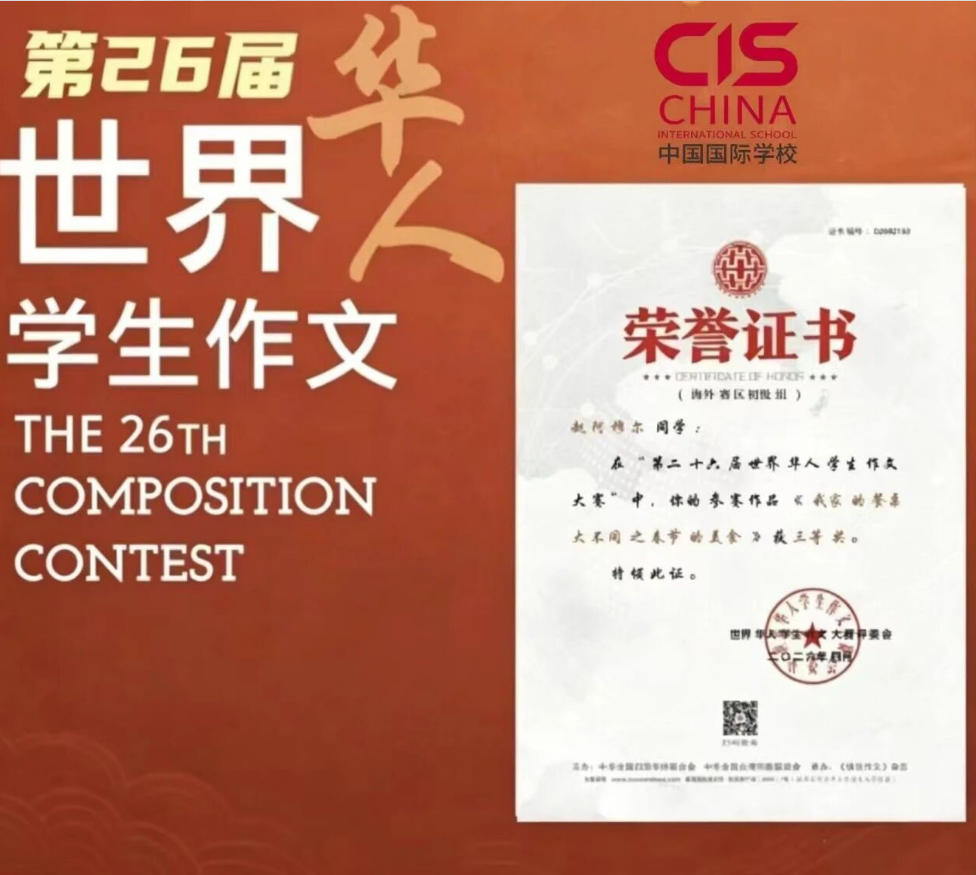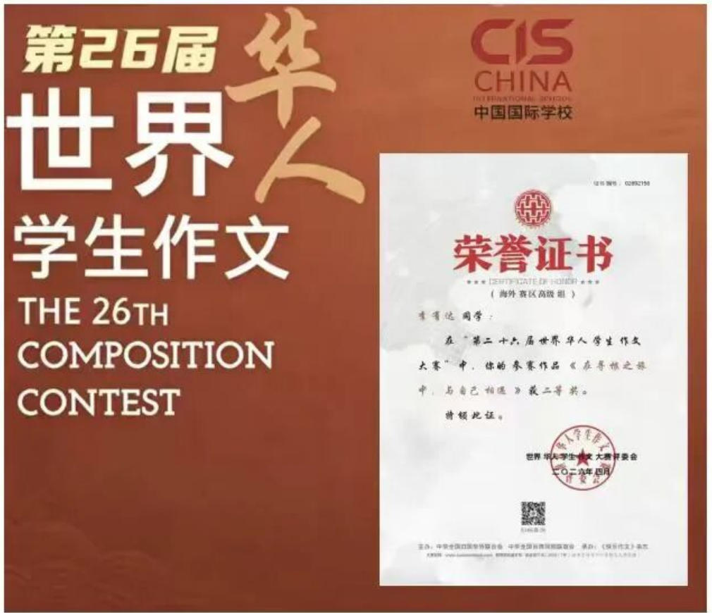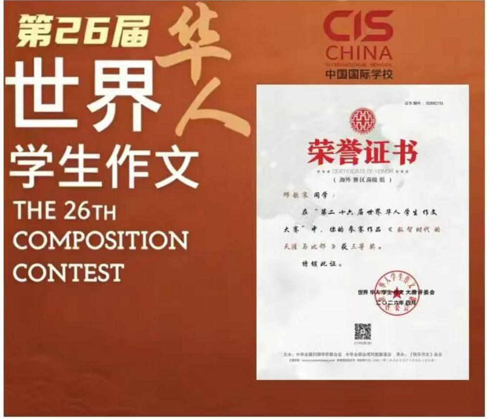 第二十六届世界华人学生作文大赛评选结果正式揭晓,泰国中国国际学校不负众望、再续辉煌,共有4名学生脱颖而出、斩获殊荣,其中二等奖1项、三等奖3项,用笔墨书写风采,用实力彰显我校语文教学、文化传承与综合素养培养的丰硕成果。